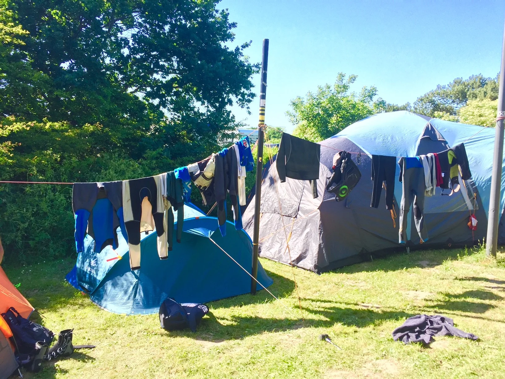 We had to think outside of the box for some things whilst camping. Here we set up a washing line to dry our sailing kit using an old mast and a mainsheet strung between a lamp post and car trailer. It worked surprisingly well!